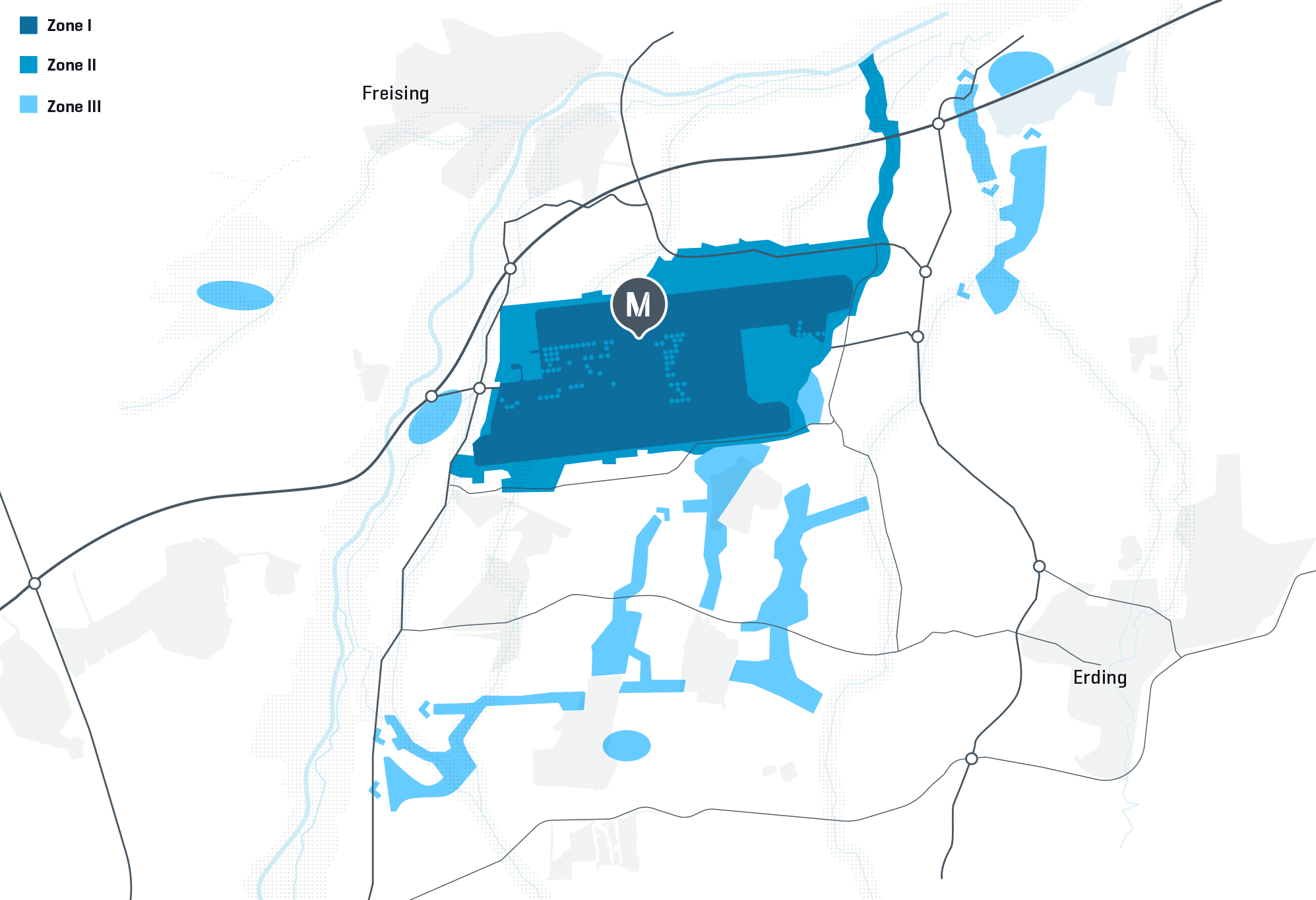 Um den Flughafen München optimal in seine Umgebung einzubetten, schuf die FMG von Anfang an Strukturen, die das weiträumige Umfeld im Erdinger und Freisinger Moos ökologisch aufwerteten und vernetzten. Dazu wurde im Rahmen der geltenden Grünordnung ein Drei-Zonen-Konzept umgesetzt: Zone I umfasst das Flughafengelände mit Start- und Landebahnsystem, Gebäuden sowie Straßen, Zone II den gehölz- und strukturreichen Grüngürtel um das Flughafengelände und Zone III die ökologischen Ausgleichsmaßnahmen.